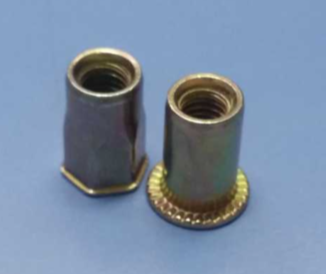 Las tuercas remachables las podemos encontrar en acero zincado o acero inoxidable. Las mas comerciales son cilindricas con un moleteado que ayuda a su fijación, pero las profesionales son hexagonales lo que permite pares de apriete mas altos sin correr el riesgo de que giren en la chapa.